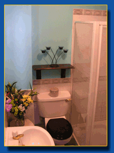 This self catering holiday apartment is fitted out with a shower room, within the shower room there is a toilet, a shower and a wash hand basin with an overhead light.